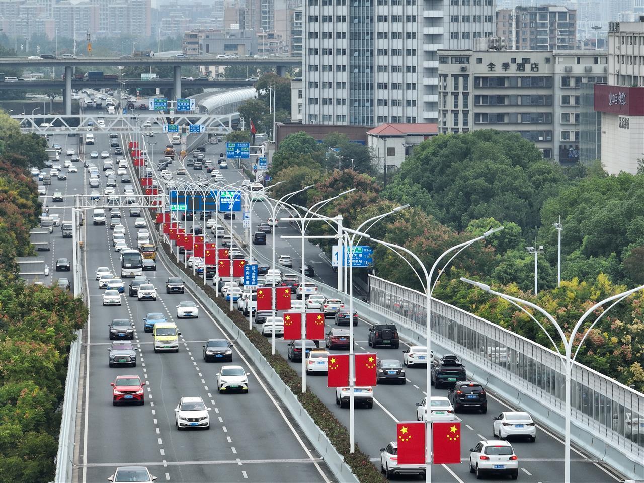 悬挂国旗和鲜花盛开,国庆节的气氛在江甘的街